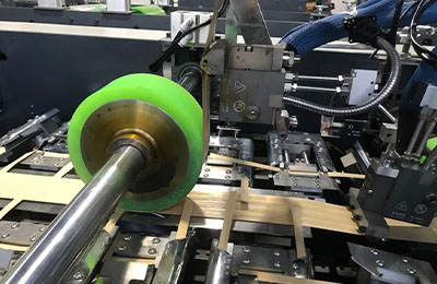 XKBS-01型全自动扁平纸袋提手制作及粘贴一体机可生产纸绳提手,并将提手粘贴到纸袋上,制成扁平纸绳纸袋。该机器以窄幅卷筒纸为原材料,进行纸绳提手的制作、切割和成型。此外,该机器还具备自动计数和自动涂胶功能,可显著提高用户后续加工操作的效率。