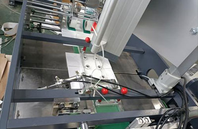 XKYS-01型自动纸袋绳柄制作及粘贴机以两卷窄幅纸卷和一卷纸绳卷为原材料,将纸带和纸绳粘合在一起,然后逐步切割,形成纸质手柄。